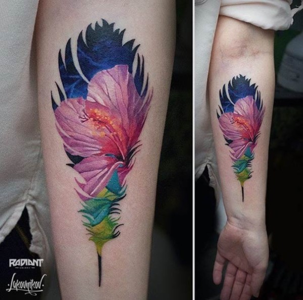 女性手臂彩色逼真的小花朵纹身图案