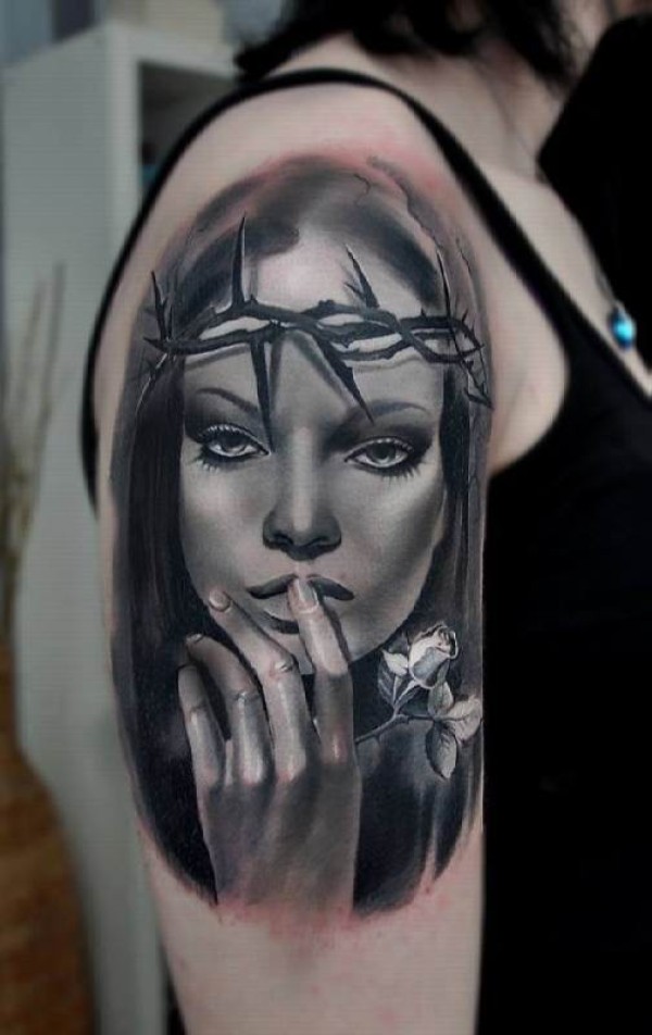 肩部灰色现实主义风格的女人肖像纹身
