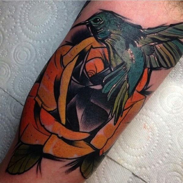 手臂彩色新学校风格蜂鸟和玫瑰纹身