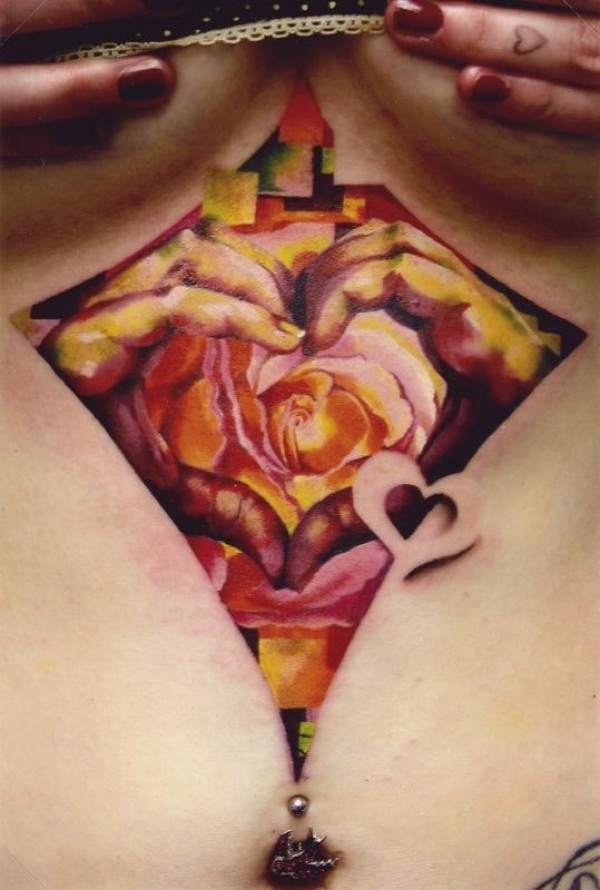 胸部彩色浪漫型玫瑰花心形纹身图案