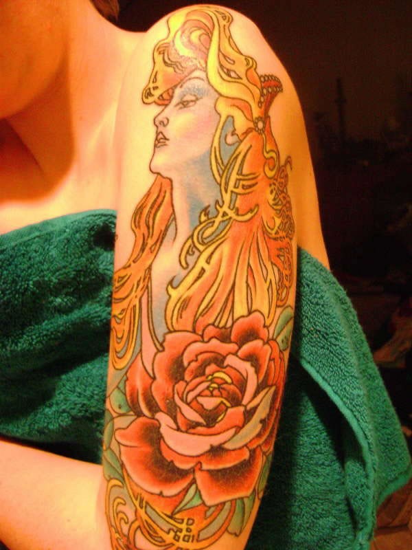 手臂彩色妇女与玫瑰花纹身图案