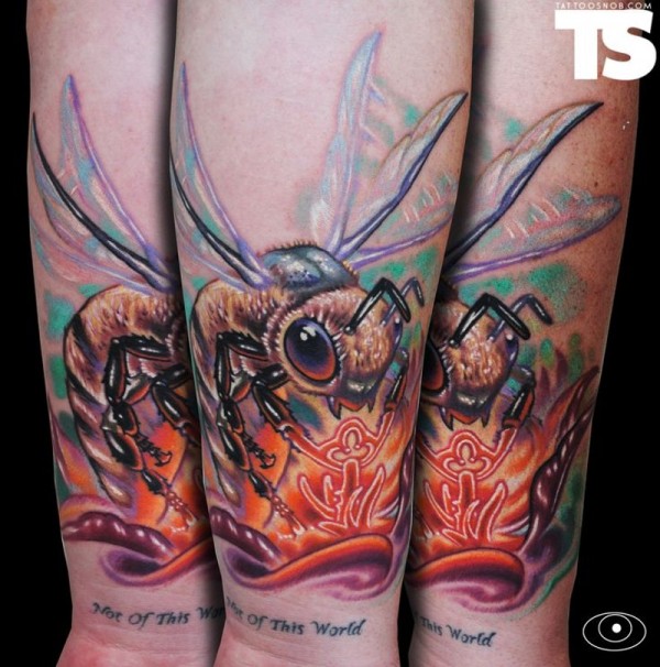 手臂彩色飞行蜜蜂和发光花纹身图案