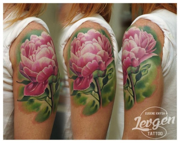 女性肩部粉红色的大花纹身图案