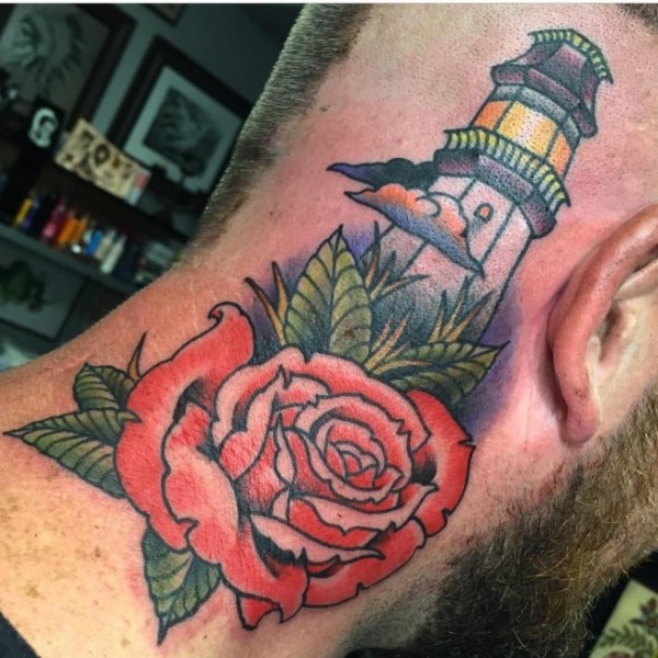 颈部古老风格的彩色灯塔与玫瑰花纹身