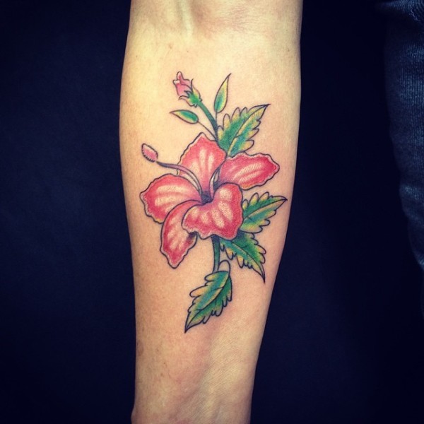 女性手臂彩色的木槿花纹身图案