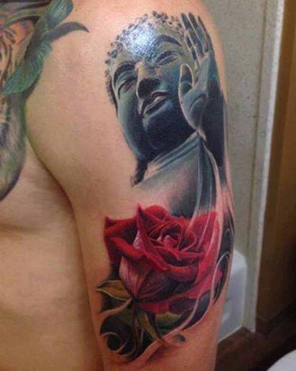 肩部逼真的如来佛祖雕像和玫瑰花纹身