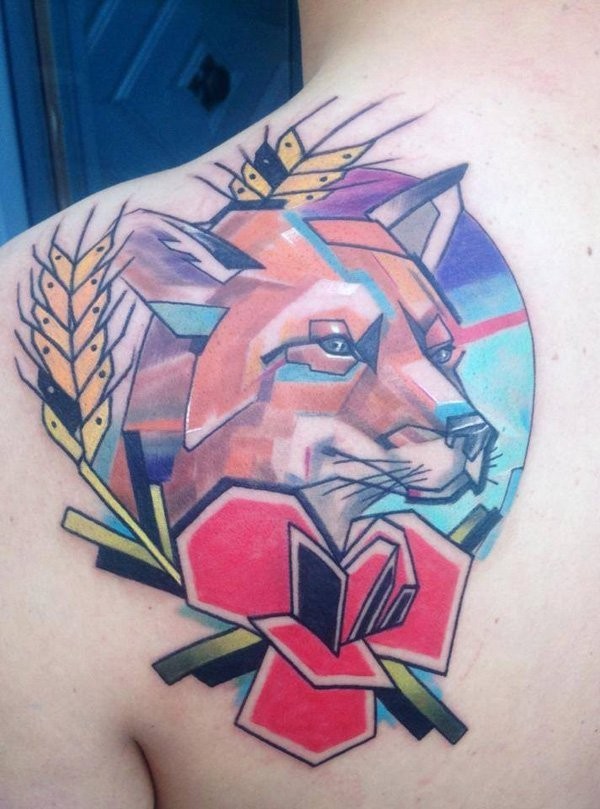 肩部彩色简单的几何风格狐狸和花纹身