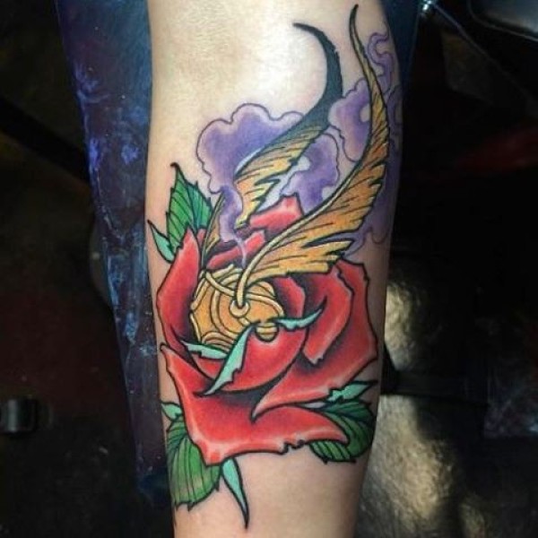 手臂彩色玫瑰花与魁地奇球纹身图案