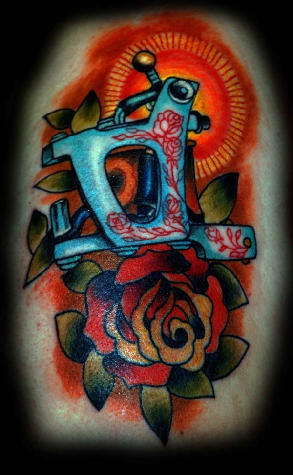 肩部古老的彩色长凳与玫瑰花纹身图片