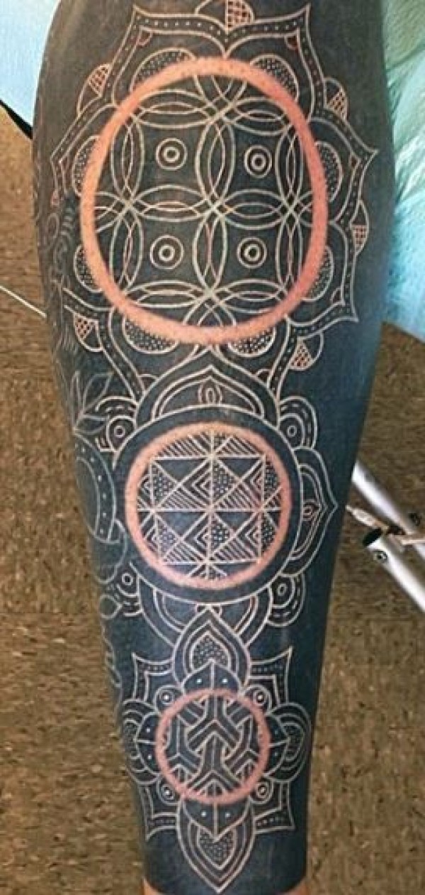 腿部华丽的白色墨水花形装饰纹身
