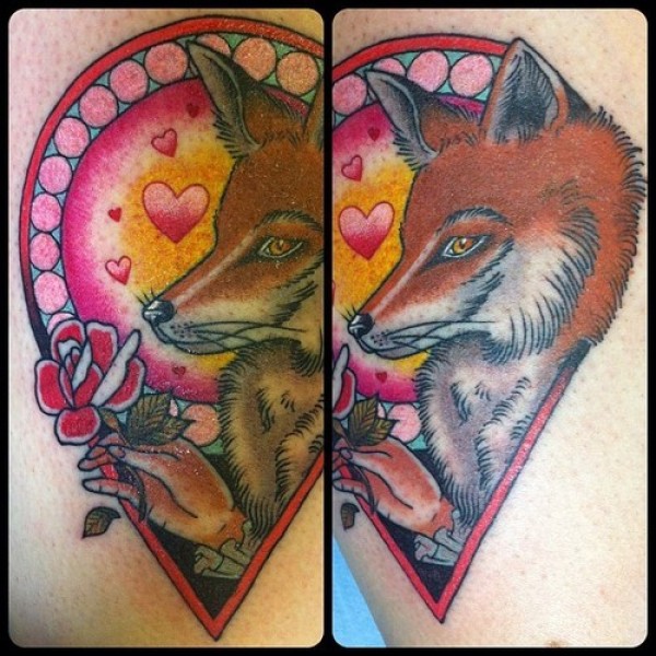 手臂浪漫风格设计的彩色狐狸与爱心纹身