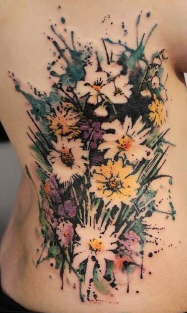 腰侧复古彩色可爱的野花纹身图案