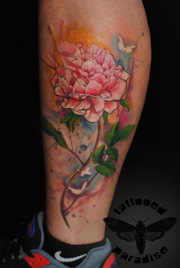 腿部水彩色牡丹花与蝴蝶纹身图案