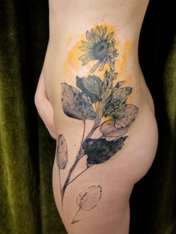 女性腰侧水彩色向日葵纹身图案