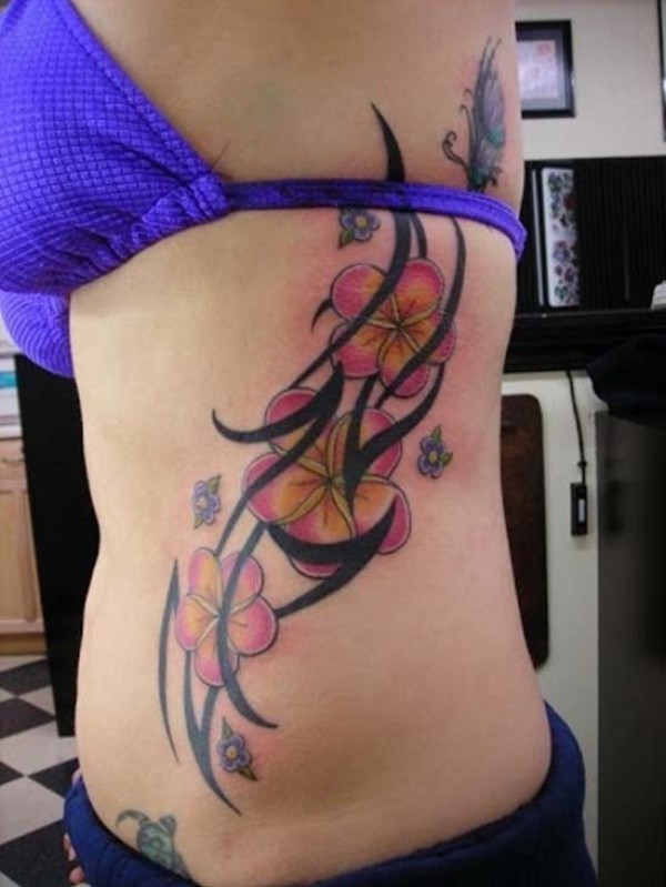 女性腰侧彩色夏威夷花朵纹身图片