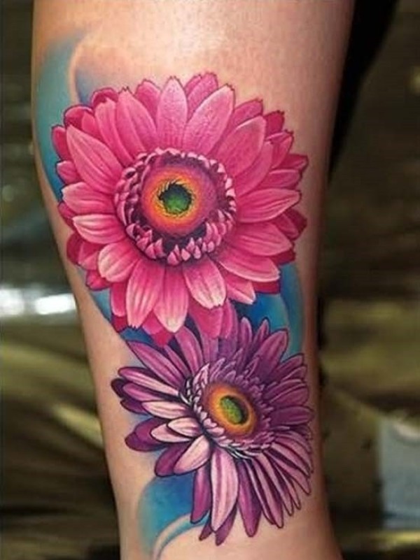 腿部彩色逼真的花朵纹身图片
