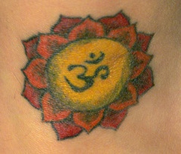 手臂彩色莲花与印度教字符纹身图片