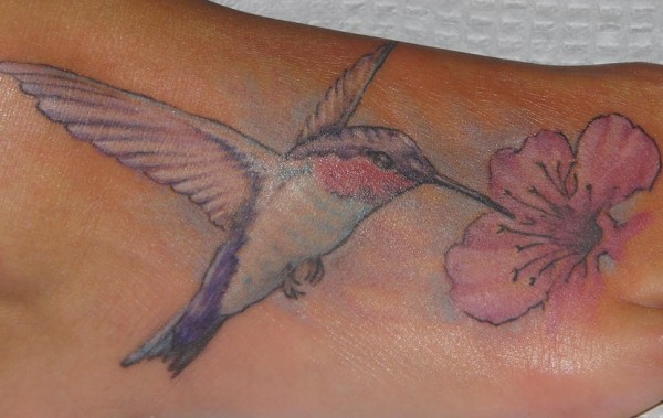脚背彩色逼真的蜂鸟与花朵纹身图片