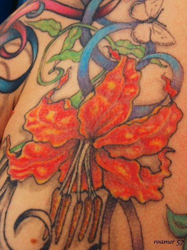 肩部彩色兰花与蝴蝶纹身图案