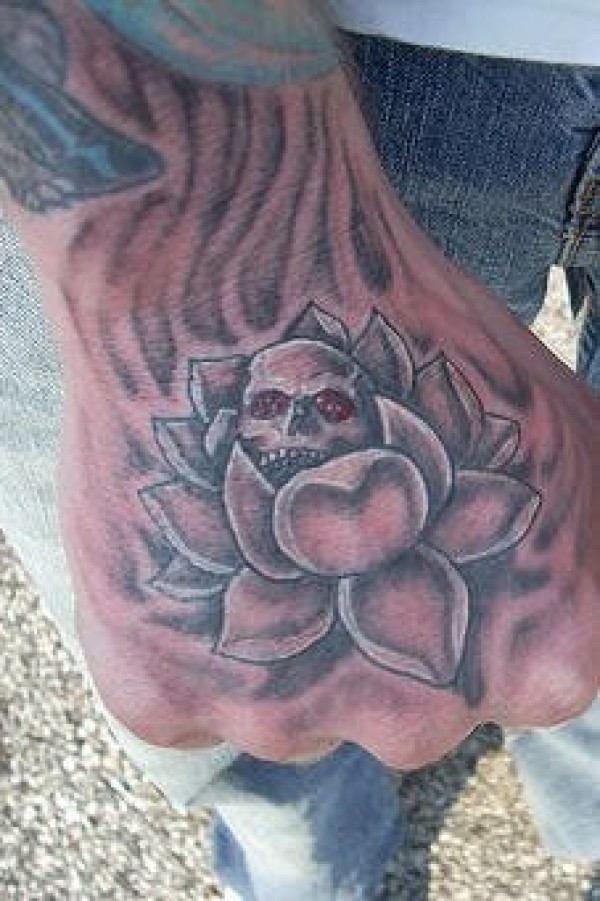 手背灰色莲花与头骨纹身图案