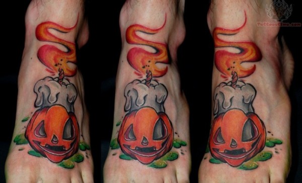 脚背滑稽彩绘蜡烛与南瓜鬼纹身图片