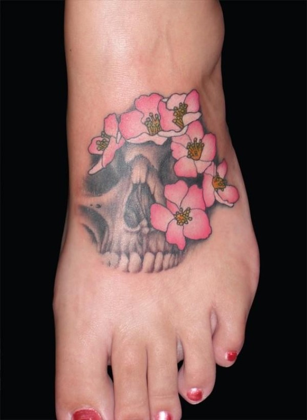 女性脚背彩色人类头骨与花朵纹身图案