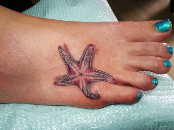 少女脚背的粉红色海星纹身图案
