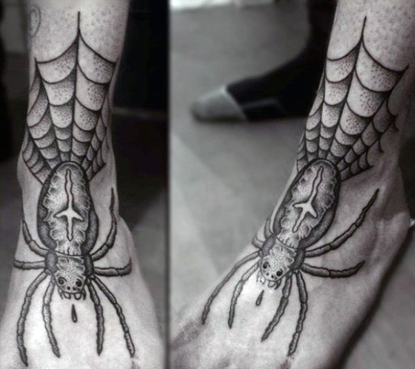 脚背黑灰色老蜘蛛和蜘蛛网纹身图案