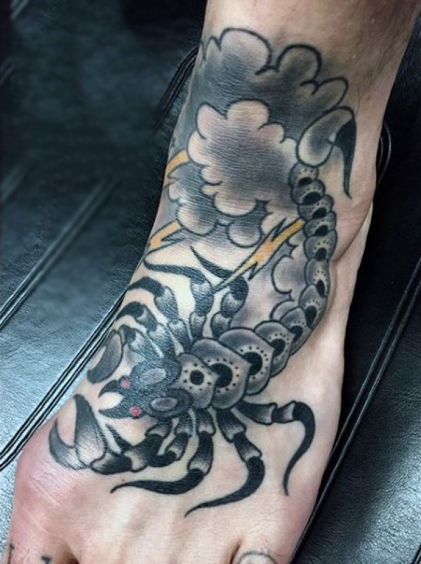 脚背老派风格的彩色蝎子纹身图案
