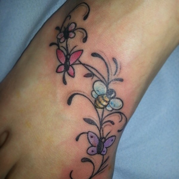 女性脚背彩色蝴蝶蜜蜂和鲜花纹身图片