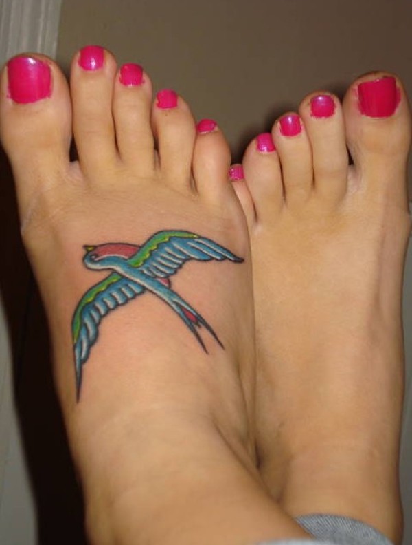 女性脚背彩色燕子纹身图案
