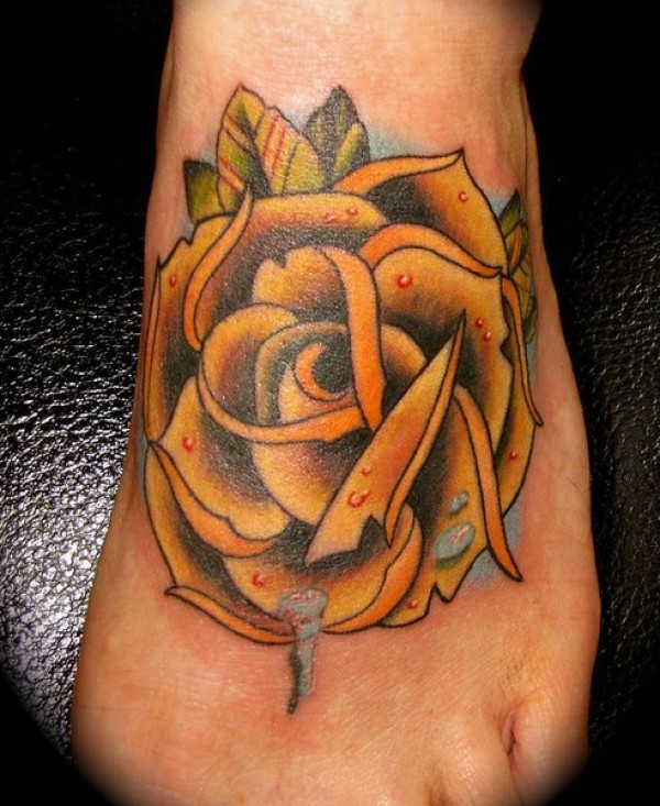 女性脚背彩色黄色玫瑰与露水纹身图片