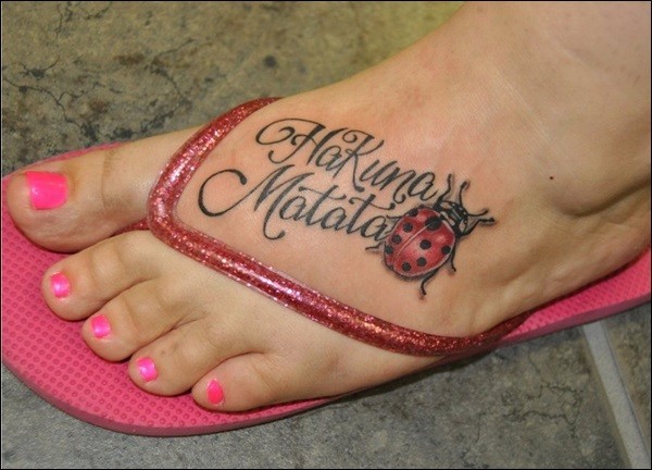 女性脚背彩色英文字母与瓢虫纹身图片
