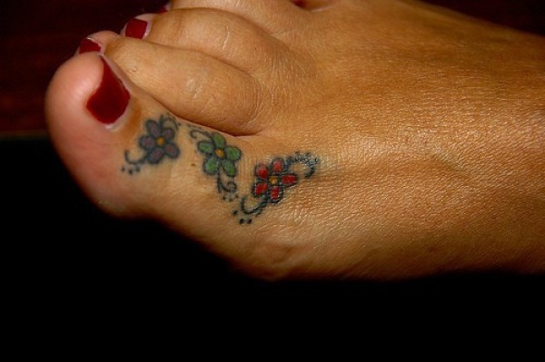 女性脚趾彩色三小花纹身图案