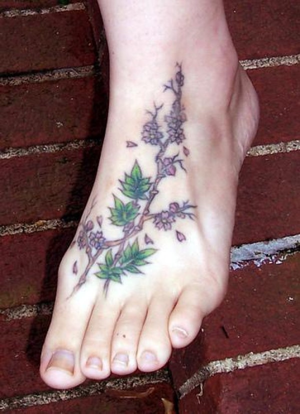 女性脚背彩色花与树纹身图案