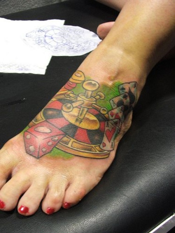 脚部彩色魔鬼的书和轮盘赌场纹身