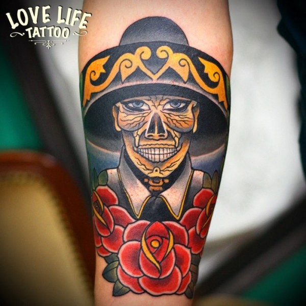 手臂彩色墨西哥骷髅与玫瑰纹身图案