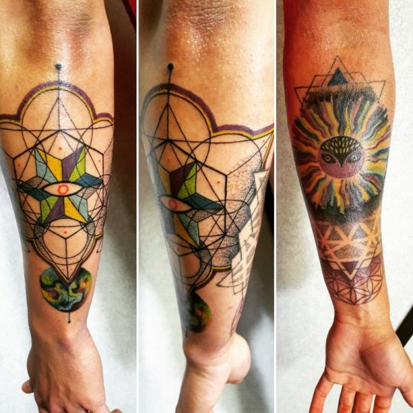 手臂印度教风格彩色装饰品和神秘太阳纹身