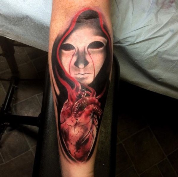 手臂彩色令人毛骨悚然的女人与心脏纹身