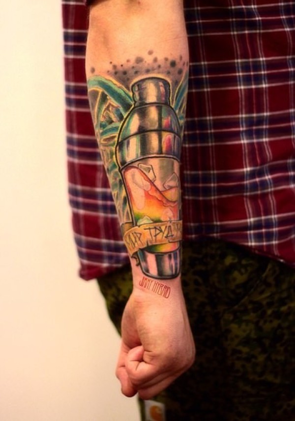 手臂彩色保温瓶与字母纹身图案