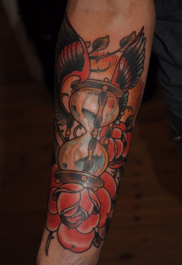 手臂彩色老学校沙漏与玫瑰花纹身图片