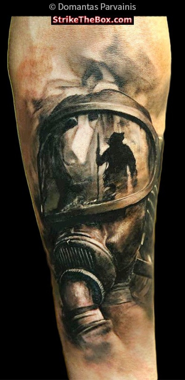 手臂写实风格的彩色带防毒面具人纹身