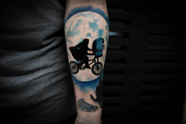 手臂全新风格的彩色男子与自行车纹身