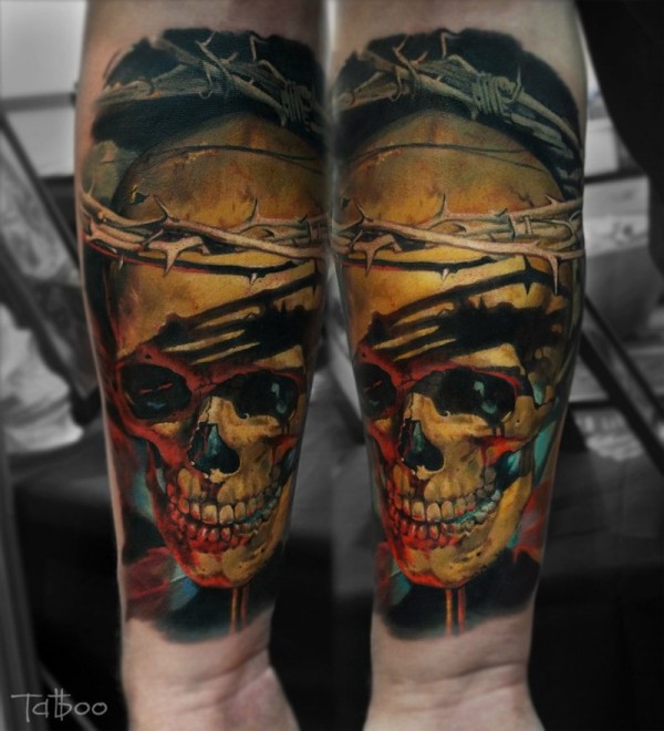 手臂现实主义风格的彩色血腥人类头骨纹身