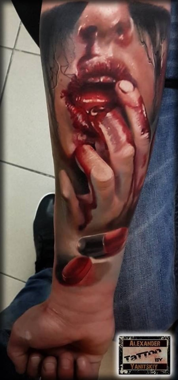 手臂令人毛骨悚然的彩色血腥的女人纹身