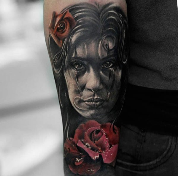 手臂新风格的彩色妇女与玫瑰纹身图片