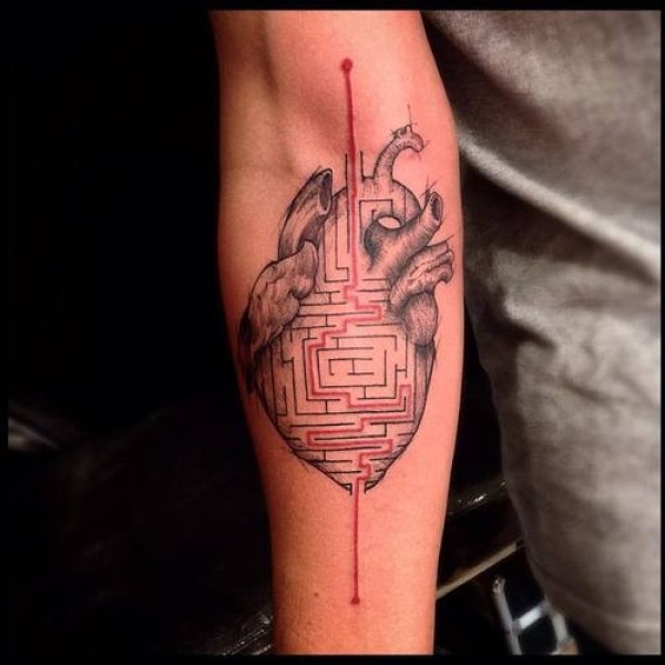 手臂原始彩色心脏与迷宫纹身图案