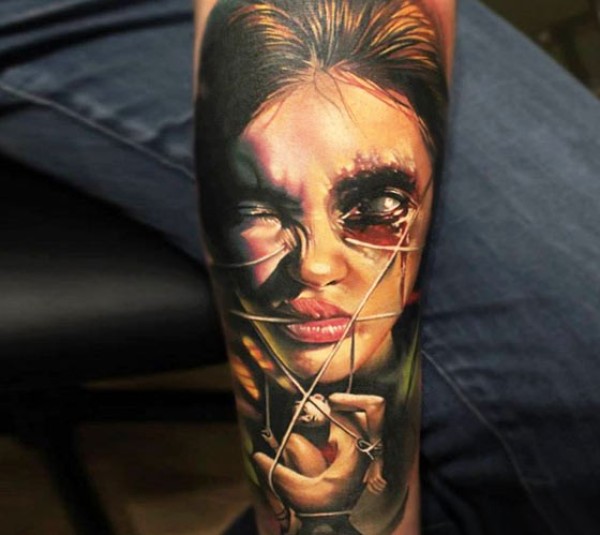 手臂彩色恐怖风格的怪物女人纹身图案