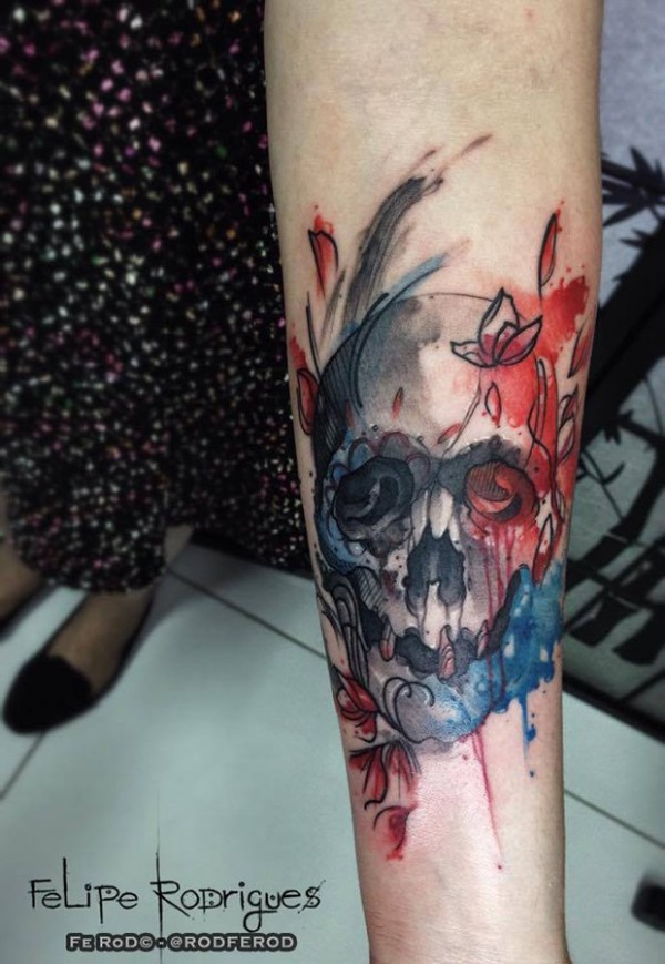 手臂古老风格的彩色人类的头骨花纹身
