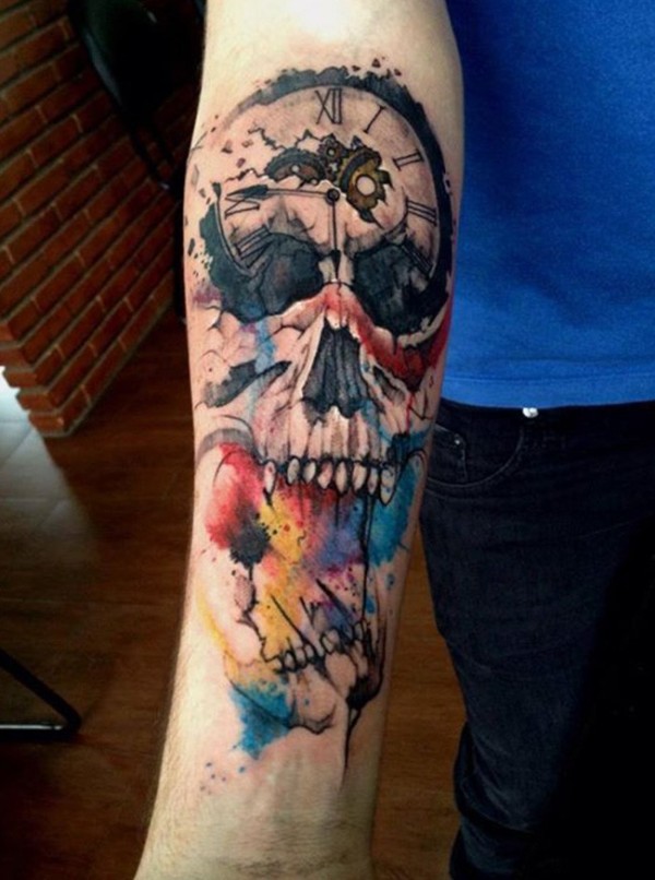 手臂超现实主义风格的彩色骷髅与时钟纹身